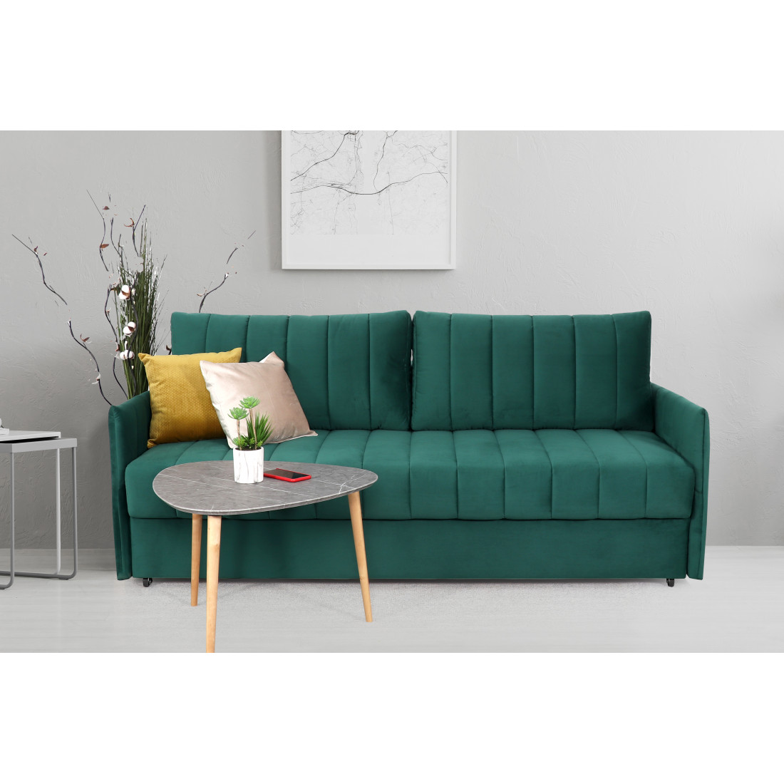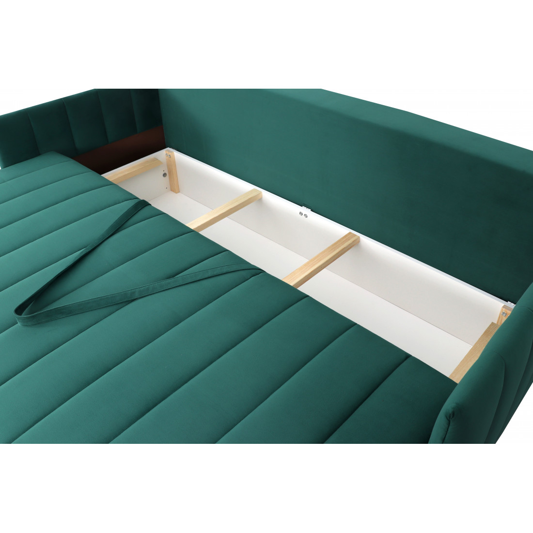 Диван удачно зонирует пространство и дополняет необходимым функционалом. В основании спального места блок независимых пружин для комфортного сна. Вместительный ящик для хранения постельных принадлежностей.