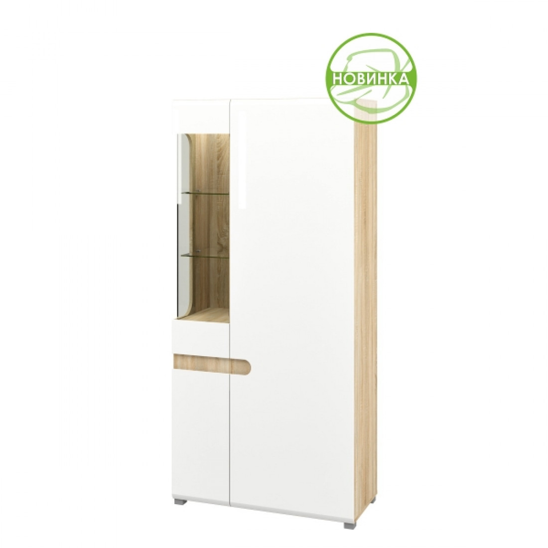 Фасад шкафа выполнен в привлекательном Белом глянце, который идеально сочетается с корпусом цвета Дуб Сонома.